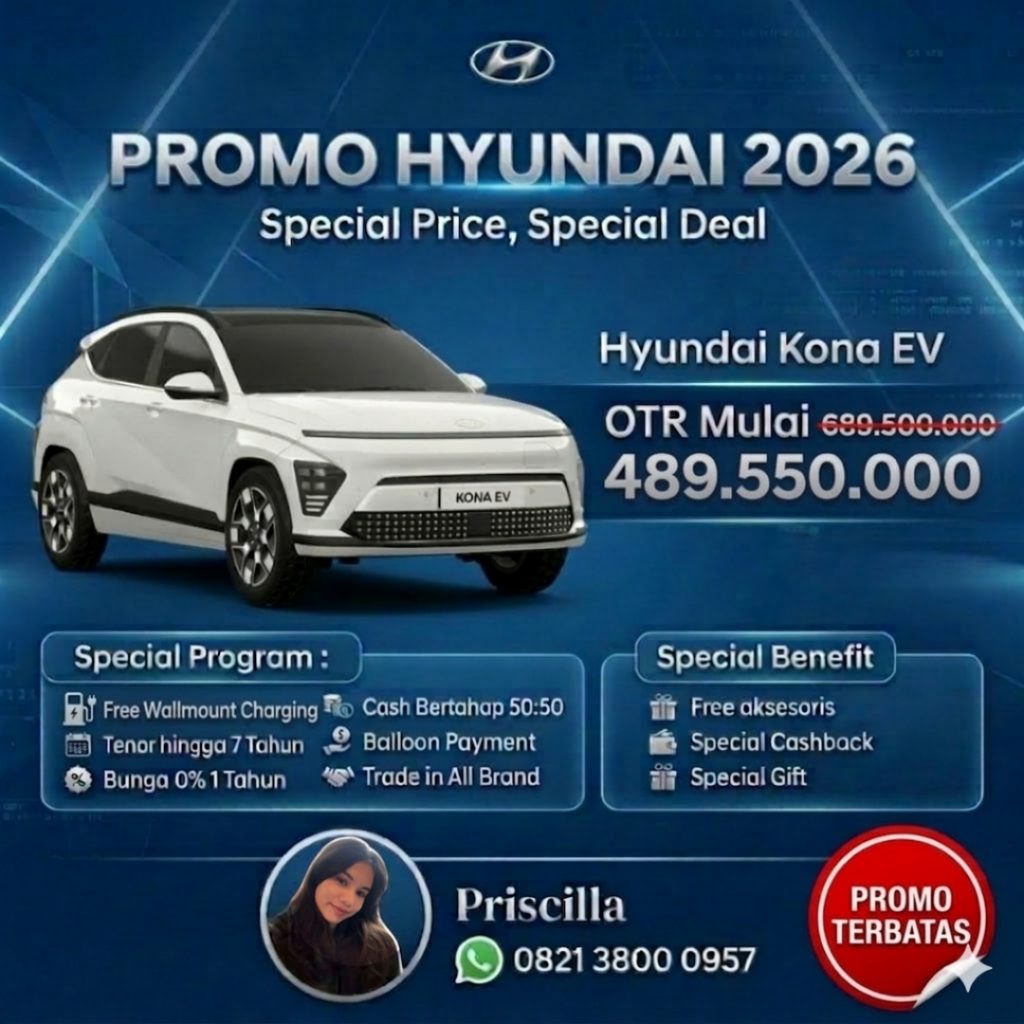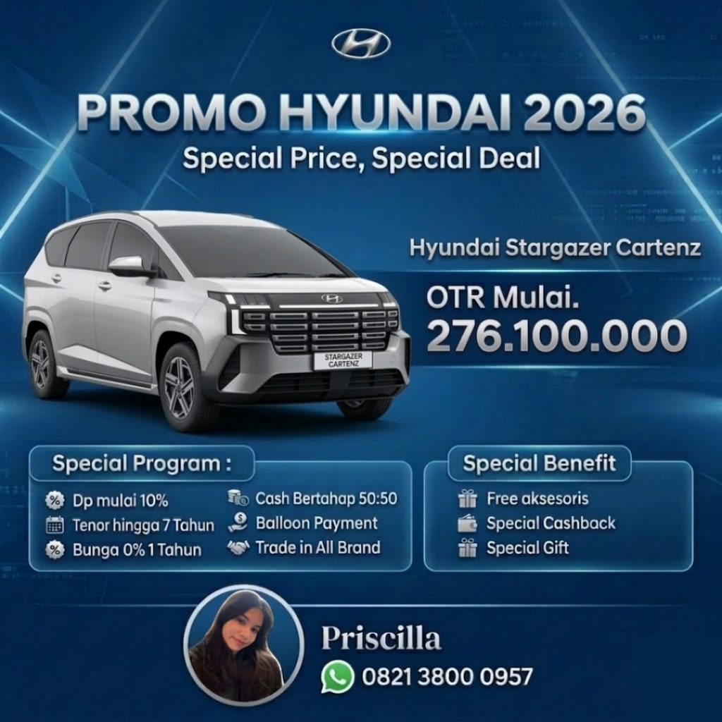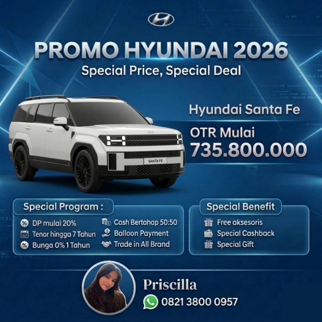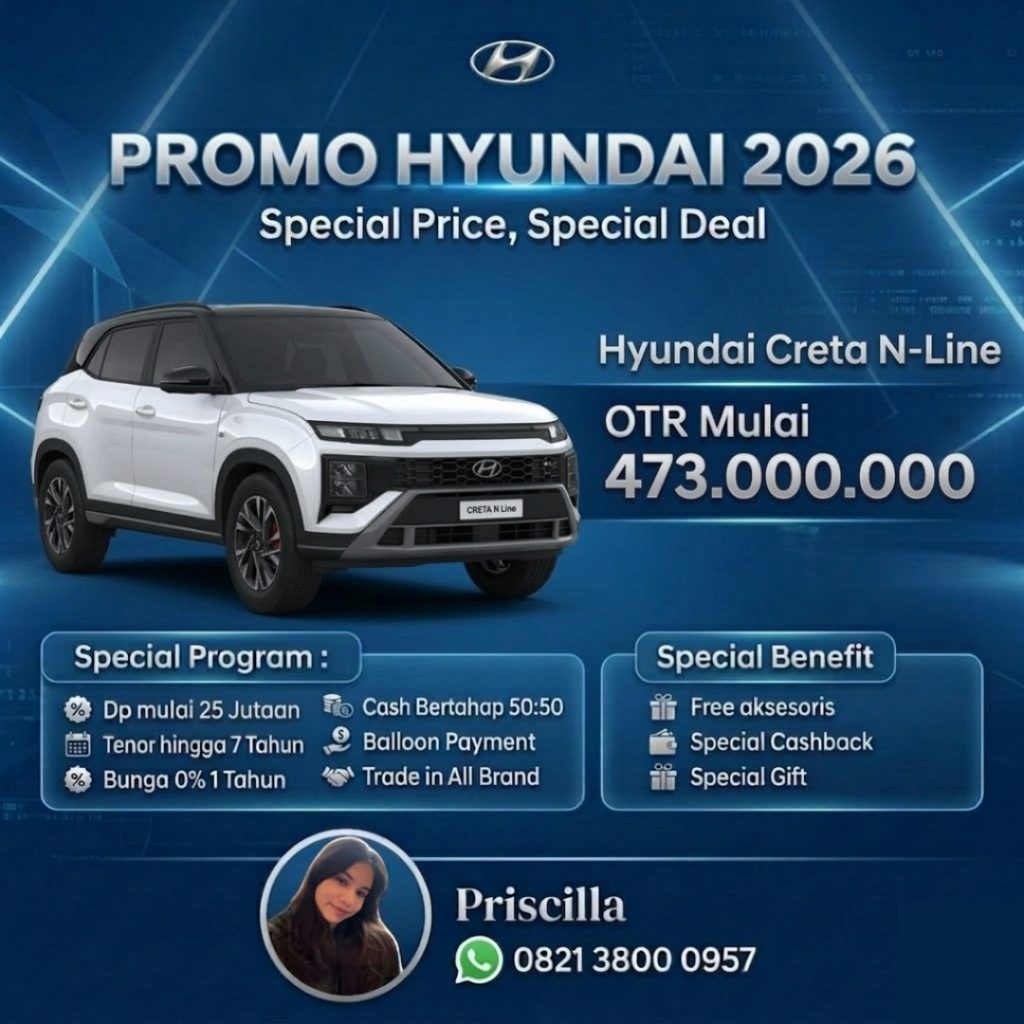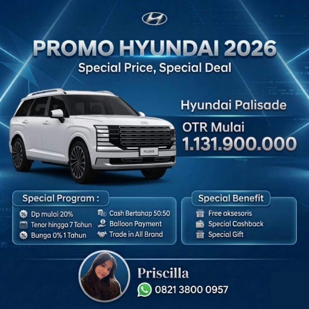Segera Miliki Mobil Hyundai Impian Anda, hubungi Priscilla Elenoar (Sales Counter) untuk mendapatkan info seputar Promo Menarik dan Hadiah Spesial untuk pemesanan kendaraan melalui website ini.
